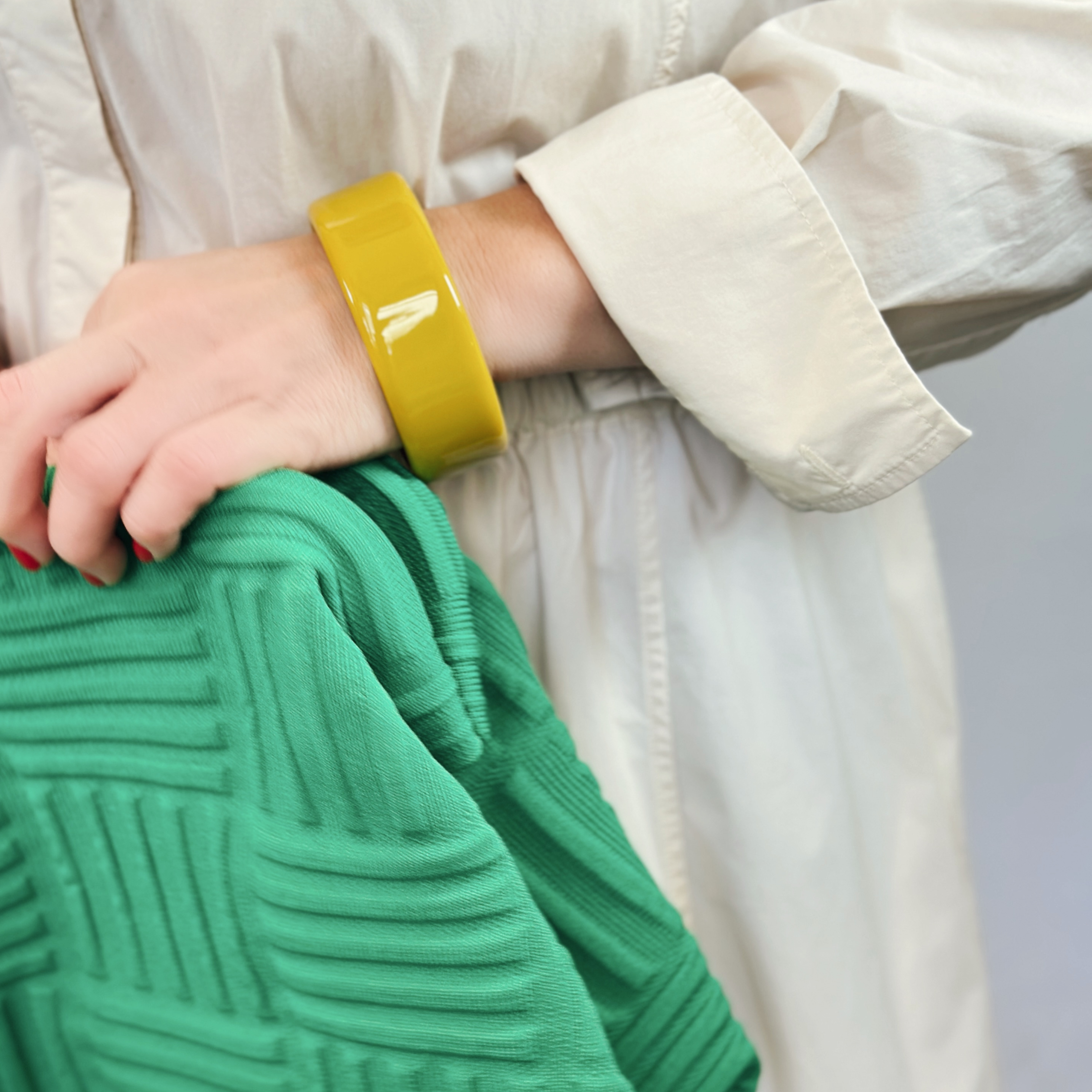 Dieser gelbe Armreif ist klar, kraftvoll und doch dezent. Ein kleiner Farbklecks mit großer Wirkung – zurückhaltend auffällig, wie wir’s lieben.