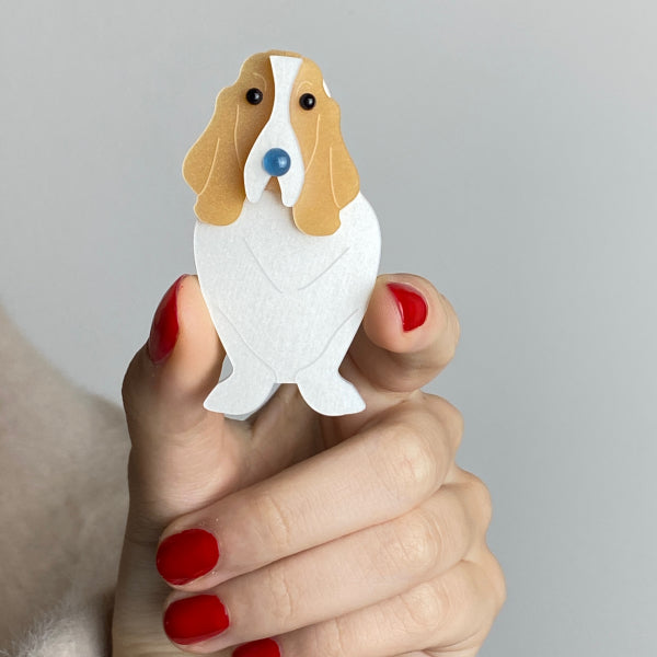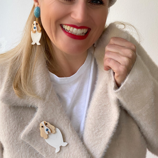 Jeder braucht einen Liebling. Das hier ist einer von uns: Unser Lieblingshündchen Alonso am Revers! Unsere gesamten Schmuckelemente werden nach eigenen Entwürfen, Farbdesigns und Vorgaben gefertigt und sind somit unverwechselbar und einzigartig!
