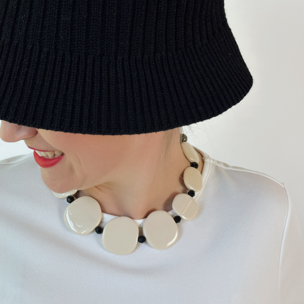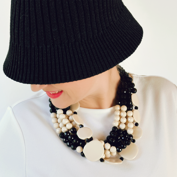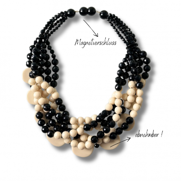 Schwarz und Weiß passen immer! Dieses einzigartige Schmuckstück ist perfekt für alle, die einen modernen und stilvollen Look lieben. Das Collier besteht aus hochwertigen Materialien und wurde mit viel Liebe zum Detail gefertigt. Die Kombination der Farben Schwarz und Weiß verleiht dem Collier eine zeitlose Eleganz, die zu jedem Outfit passt. Egal, ob Sie es zu einem formellen Anlass oder im Alltag tragen möchten, dieses Collier wird sicherlich alle Blicke auf sich ziehen.Die Länge der kürzesten Reihe beträgt 53 cm und kann gerne auf Wunsch verlängert oder verkürzt werden. Hierfür verrechnen wir eine Aufzahlung, da es sich um eine Sonderanfertigung handelt!