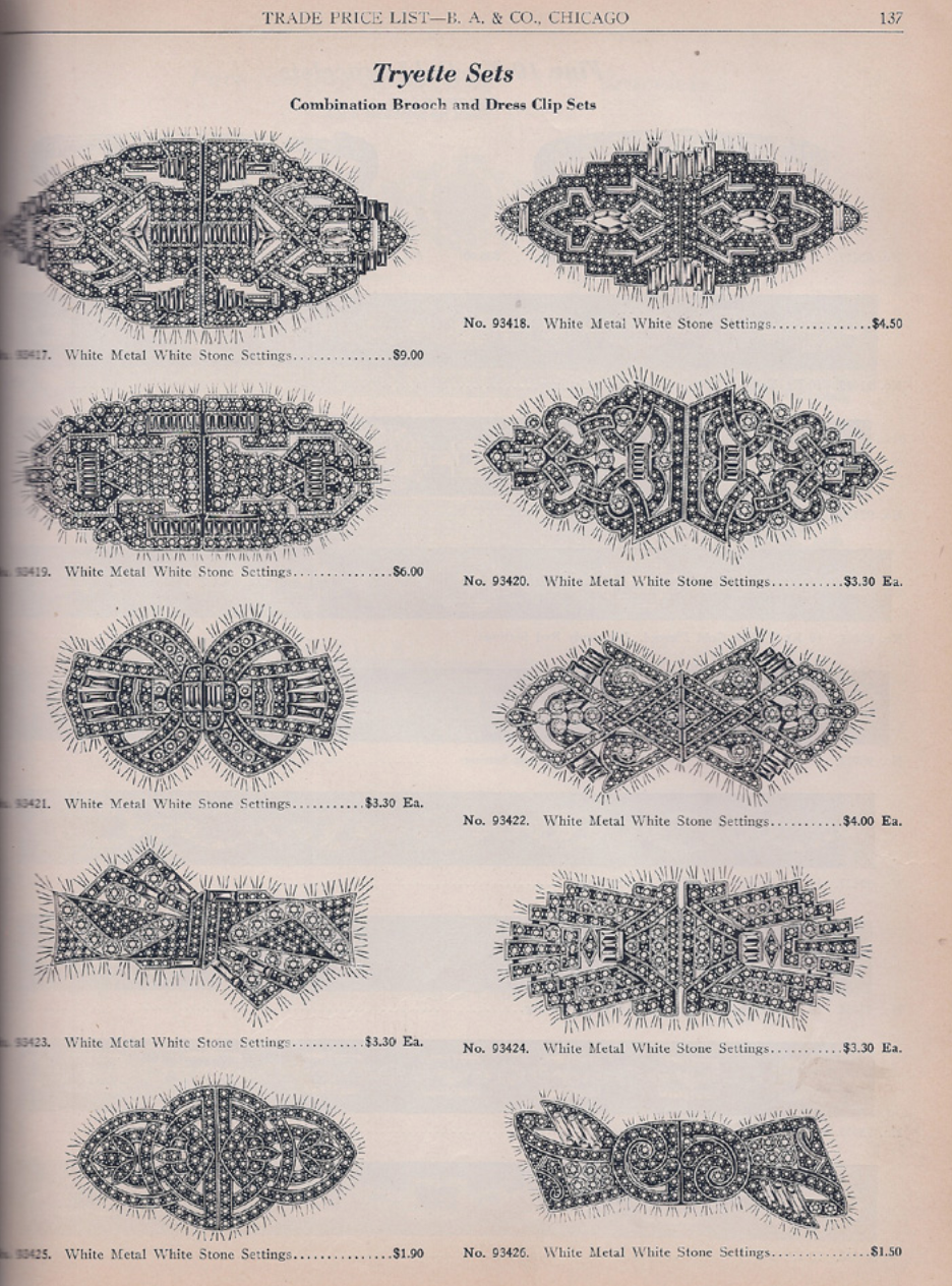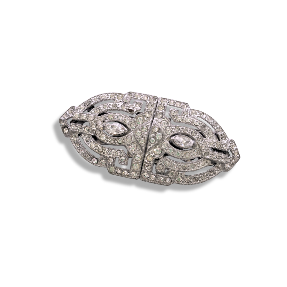 Diese außergewöhnliche Brosche in eleganter Navette-Form ist ein signiertes Original von Coro Duette – einem der innovativsten Konzepte in der Geschichte des Modeschmucks. Unter der Patentnummer 1852168 (eingetragen 1932) ließ sich Coro die Idee schützen, eine Brosche zu kreieren, die sich in zwei einzelne Reversclipse teilen lässt. So konnte ein Schmuckstück flexibel getragen werden – entweder als imposante Brosche oder als zwei raffinierte Clips, die an Revers, Kragen, Hüten oder sogar Schuhen befestigt wurden.