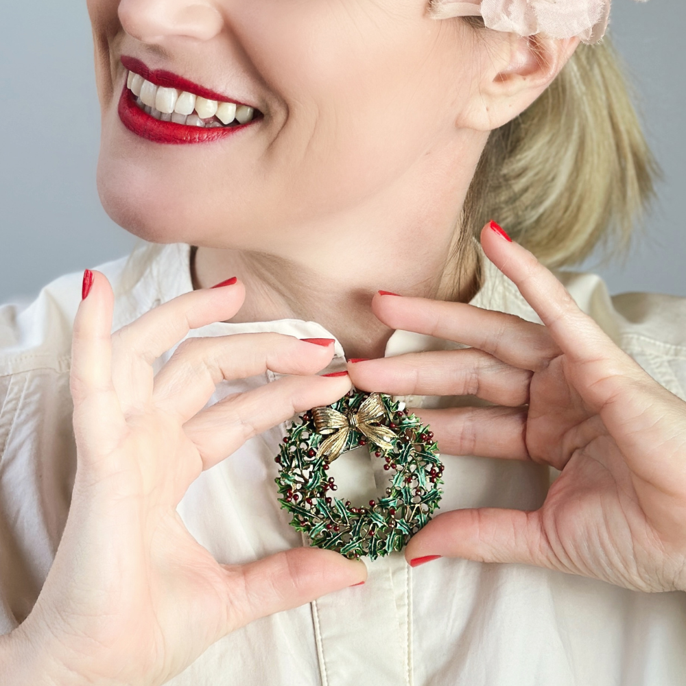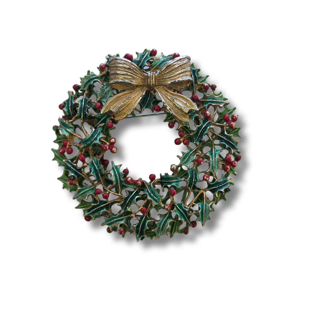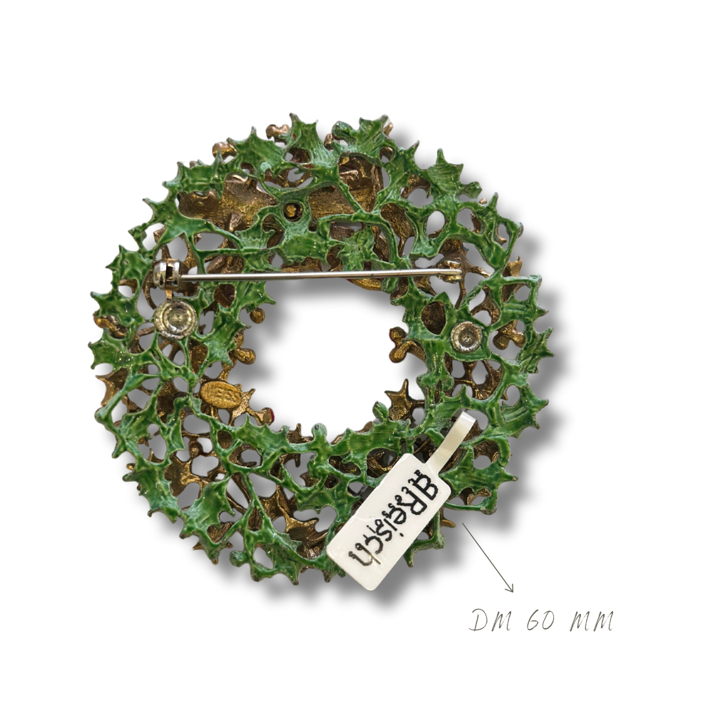 Diese bezaubernde Vintage Brosche in Form eines festlichen Weihnachtskranzes stammt aus dem traditionsreichen Hause Weiss, bekannt für detailreiche und funkelnden Modeschmuck seit den 1940er Jahren. Gefertigt aus Tombak, kunstvoll emailliert und mit typischer Sorgfalt signiert, verbindet dieses Schmuckstück charmante Festlichkeit mit hochwertigem Design.
